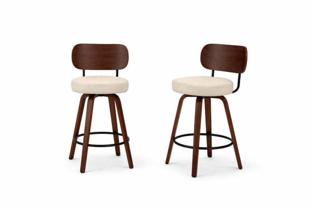Set of 2 Swivel Bar Stools with Wooden Backrest and Cream Seat Cushions