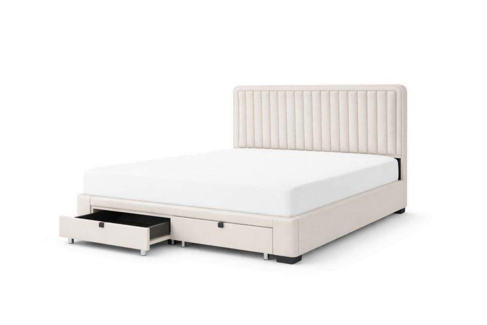 Beige Polyester Upholstered Bed Frame with Storage Drawers and Ribbed Headboard